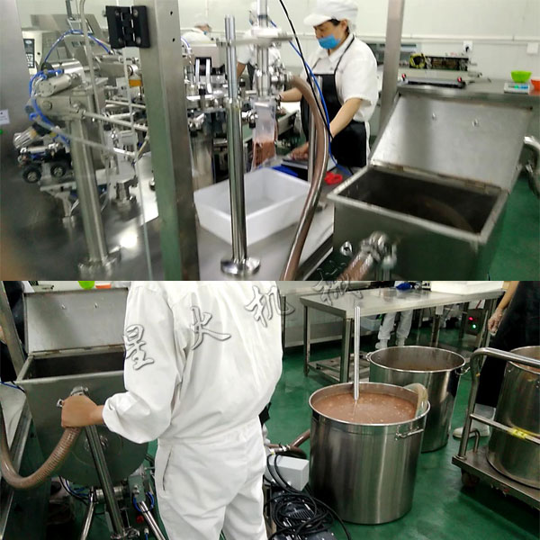 6、牛油火鍋底料自動化生產線整套設備智能灌裝系統:全自動灌裝機對物料進行雙料、單料灌裝;